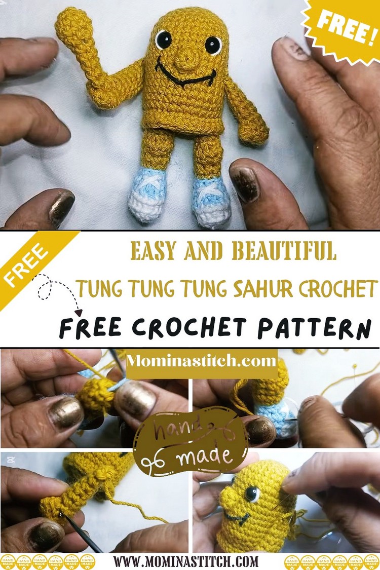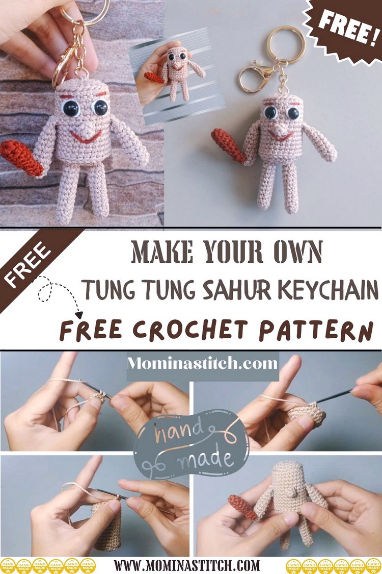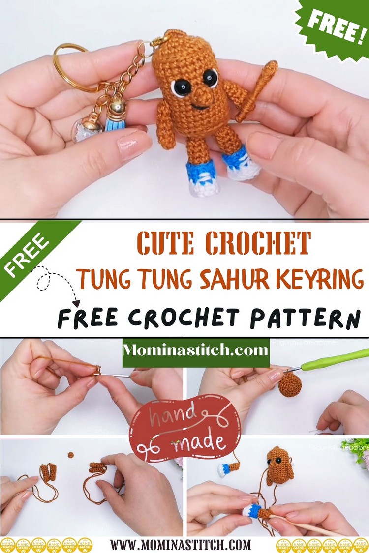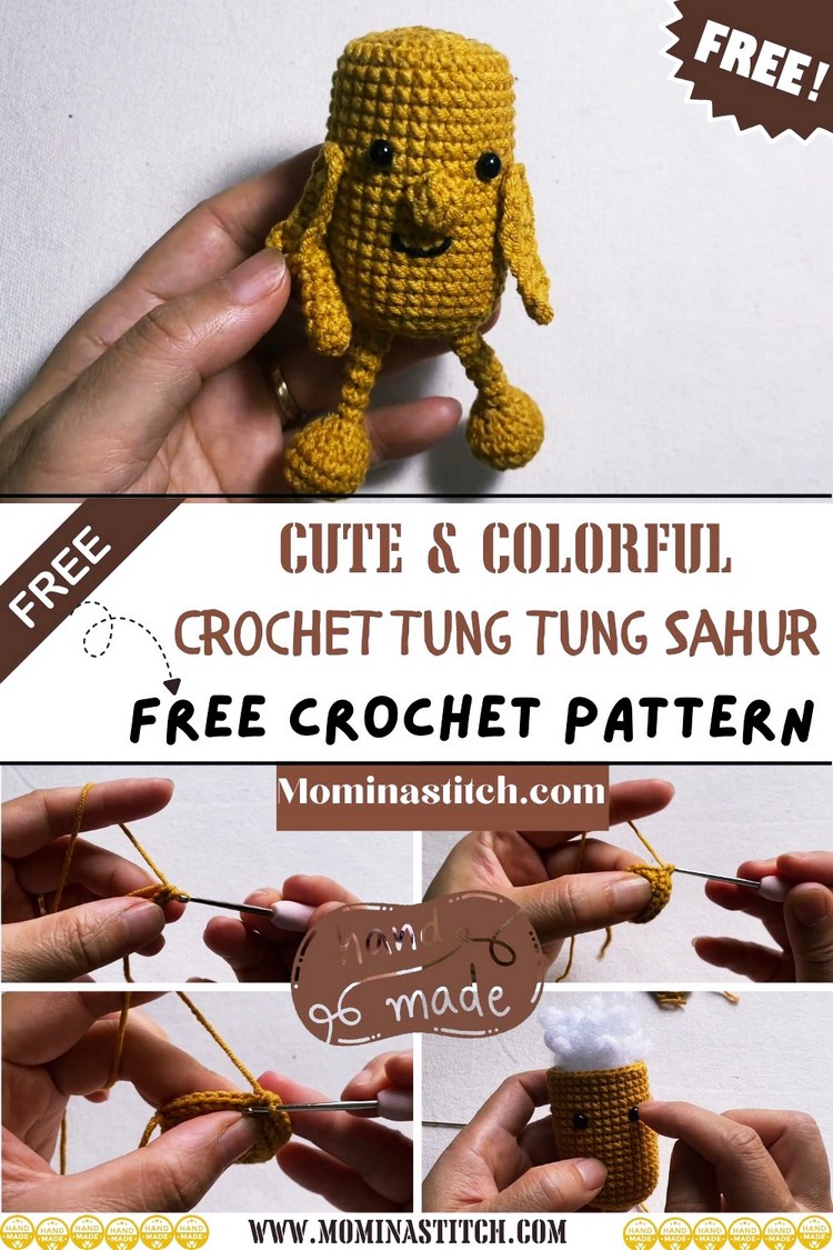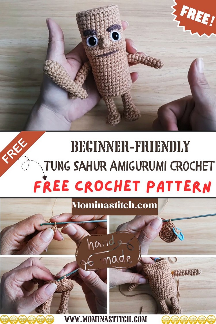 If you’re new to crochet, this beginner-friendly tutorial is the perfect place to start. The Tung Sahur character is made with simple stitches and easy construction, so you can finish your first amigurumi without frustration. The small size makes it a quick project, but the results are still super cute and satisfying. It’s ideal as a keychain, charm, or mini desk decoration. A confidence-boosting project for anyone learning the joy of crochet.