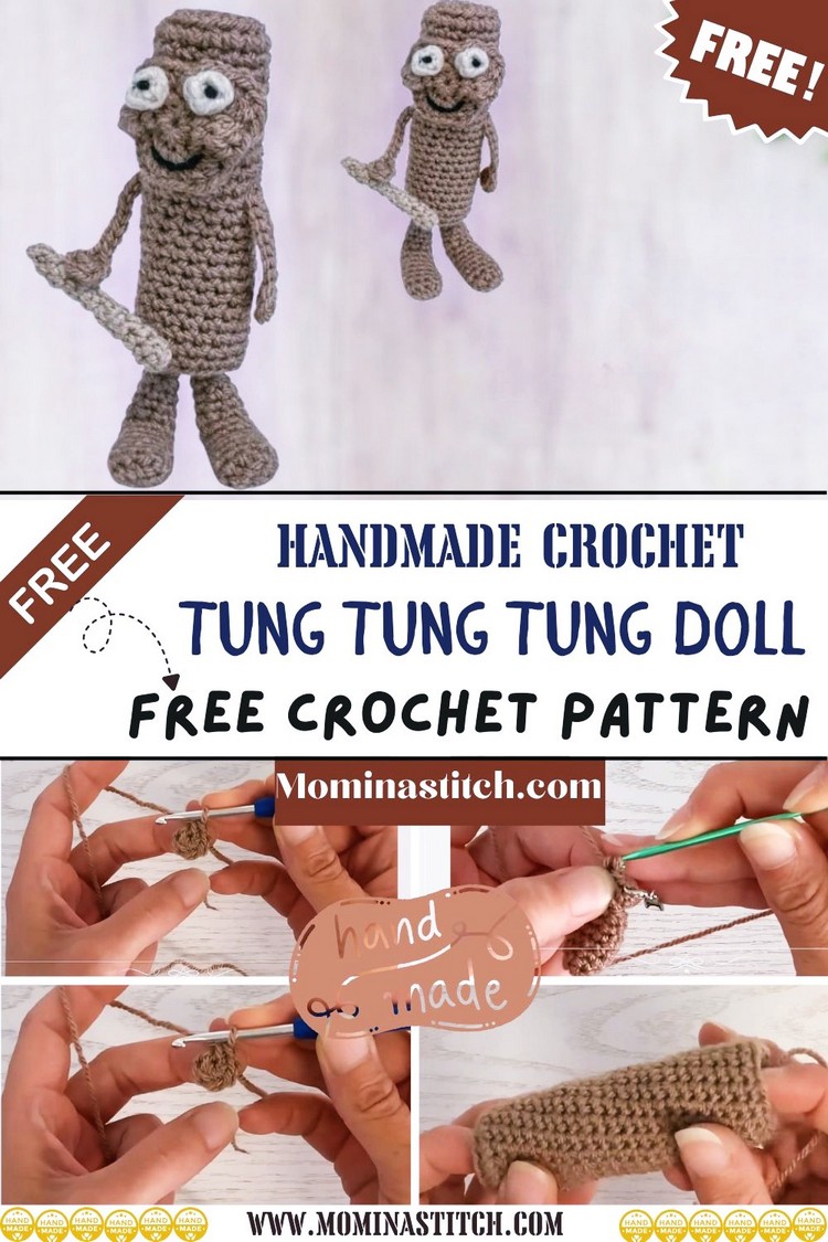 If you want something a little bigger than a keychain, this Tung Tung Sahur doll tutorial is a fantastic choice. The design is still simple enough for beginners, but the larger size lets you practice shaping and stuffing. It’s giftable, decorative, and makes a cute toy or desk buddy.