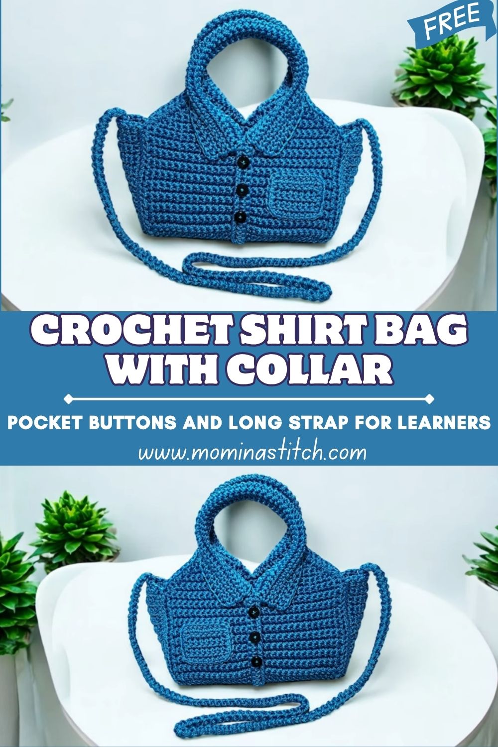 Crochet Shirt Bag With Collar Pocket Buttons and Long Strap For Learners