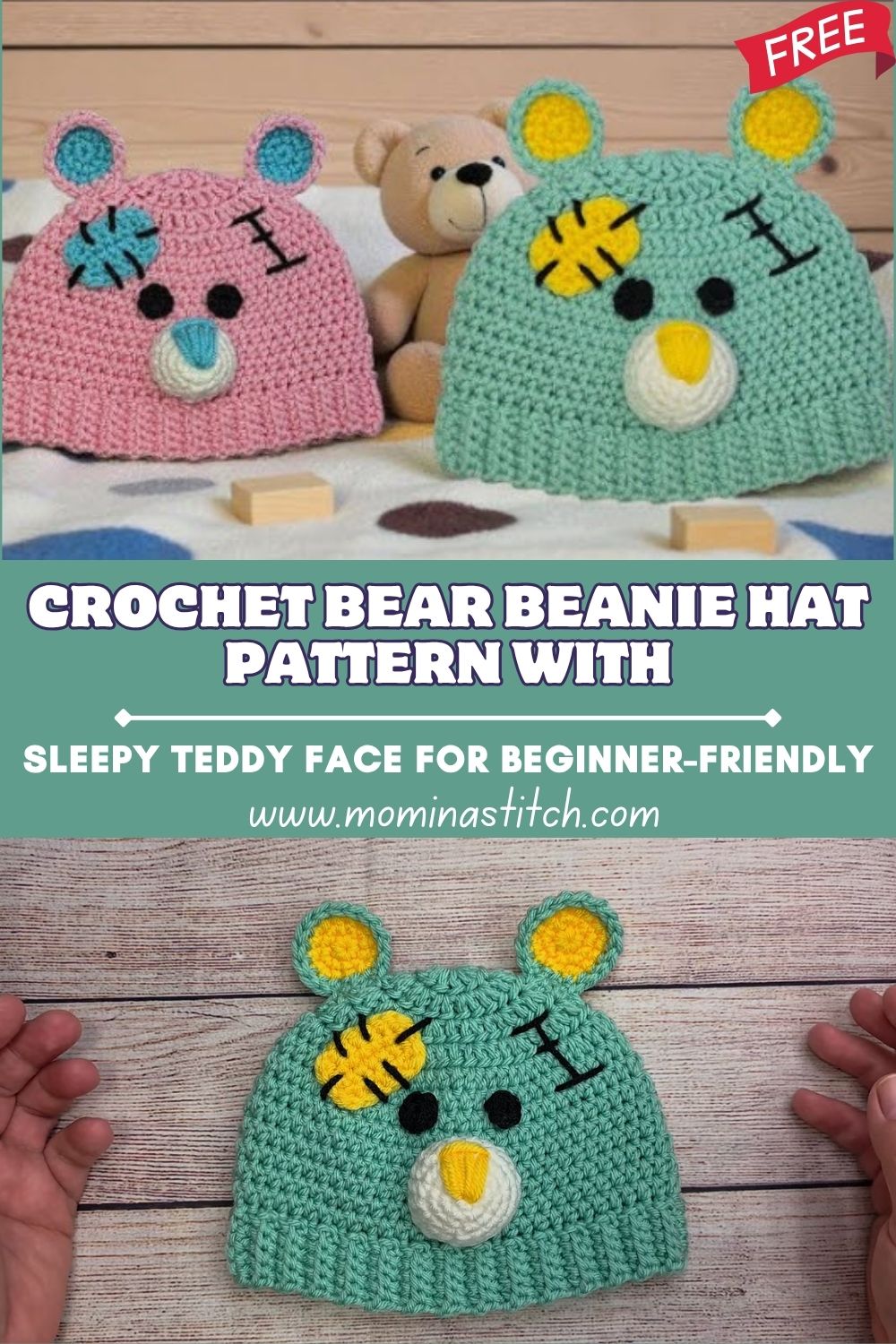 Crochet Bear Beanie Hat Pattern With Sleepy Teddy Face for Beginner-Friendly