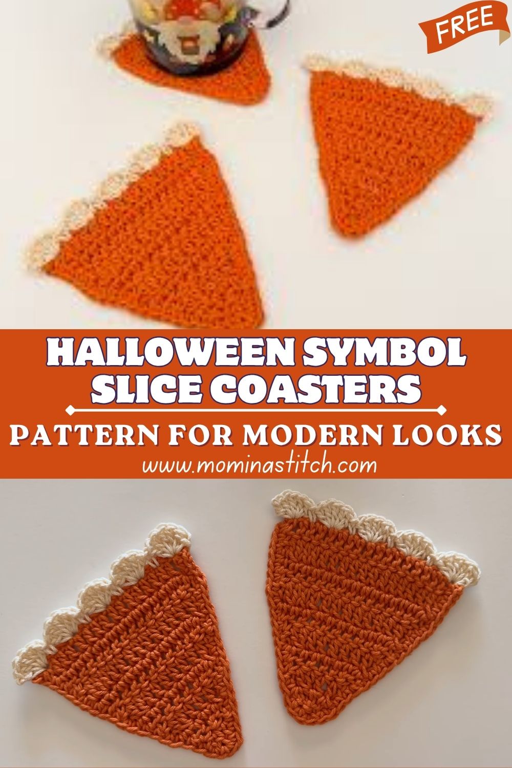 This classy design blends slice coasters with subtle Halloween symbols for a sleek seasonal statement. Keep the palette neutral or go dramatic for a modern tablescape. The motif adds personality while the coaster stays functional and flat. Use modern crochet decor with Halloween coaster pattern details for dinner parties, apartment styling, or minimalist fall displays.